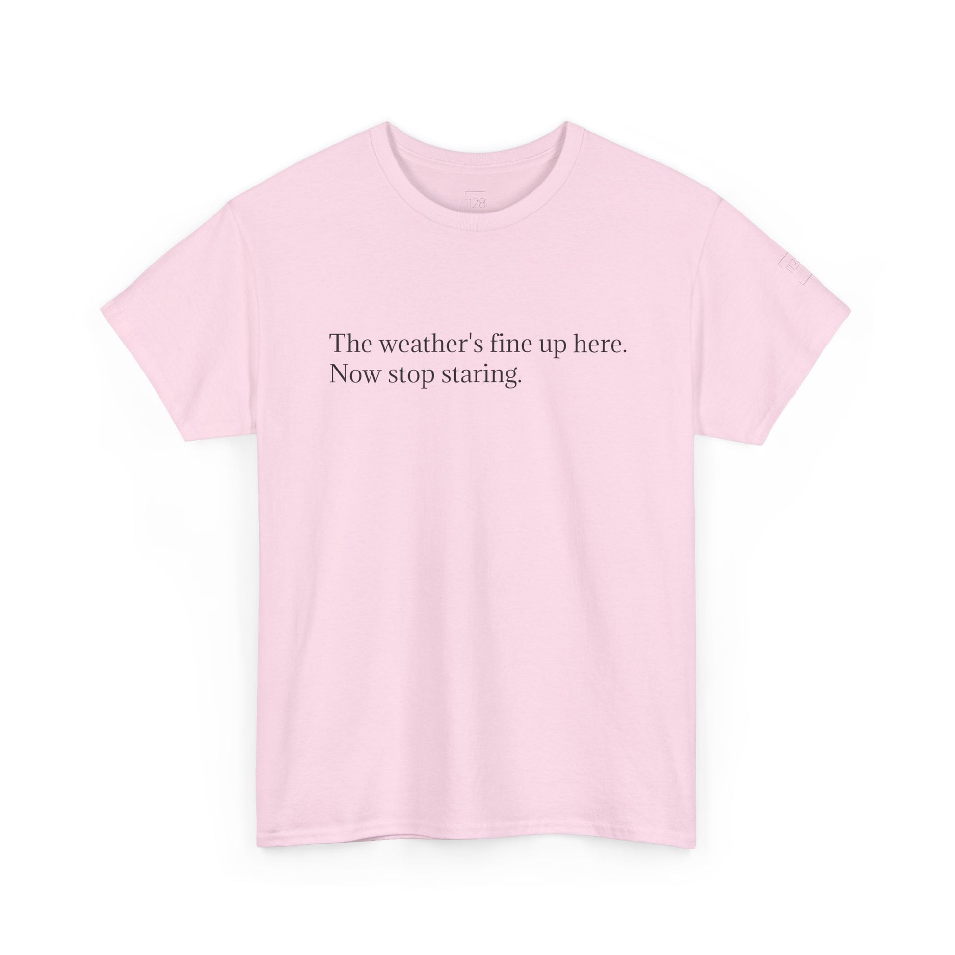 You know how literally anyone under 5'8 asks "How's the weather up there?" Give them something to look up to. Whether you dress it up, down, casual or for the gym, "The weather's fine up here. Now stop staring" tee has a natural cotton texture and durable knit.